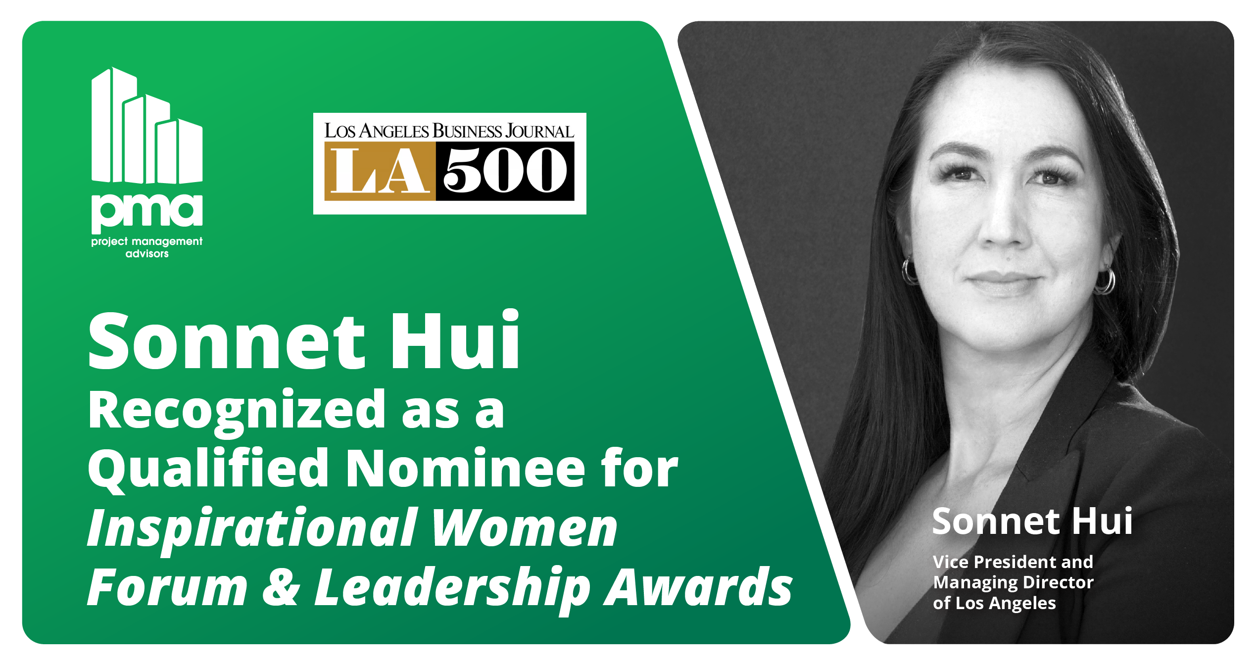 PMA is proud to announce that Sonnet Hui, Vice President and Managing Director of PMA’s Los Angeles office, has been recognized as a qualified nominee for the prestigious Inspirational Women Forum & Leadership Awards in celebration of her remarkable achievements and leadership over the past 24 months.